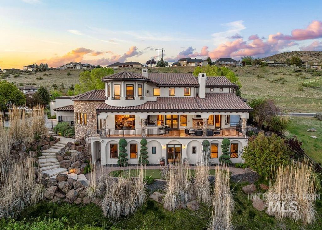 Unbelievable Table Rock Views with a spectacular Boise foothills setting! Custom-built one-owner estate captures breathtaking 180° views and intimate privacy, surrounded by protected wildlife land. Recently refreshed with new exterior paint, new hardwood flooring, and a beautifully updated kitchen, the home blends timeless design with modern upgrades. Soaring two-story ceilings and expansive windows frame sweeping valley views, while the spacious floor plan offers exceptional areas for everyday living and entertaining. The renovated kitchen features a new island, countertops, backsplash, sinks, and brand-new appliances, complemented by rich cabinetry and a butlers pantry. New hardwood flooring extends through the hallway, kitchen nook, kitchen, family room, and primary suite. The main-level primary retreat offers balcony access overlooking Table Rock and a spa-inspired bath with heated floors, dual vanities, and a large dressing room. Additional highlights include a library with rolling ladder, curved executive office, formal dining room, and guest suite with private entry. The walk-out includes a bonus room with kitchenette and full gym, offering fully equipped guest quarters. Outdoor living shines with a wraparound deck featuring a built-in kitchen, fireplace, in-ground hot tub, and putting green, just minutes from downtown Boise.